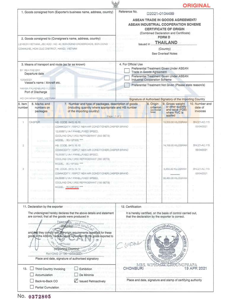 Chứng nhận CO&C/Q Điều hòa Casper 1 chiều 24000BTU SC-24FB36M