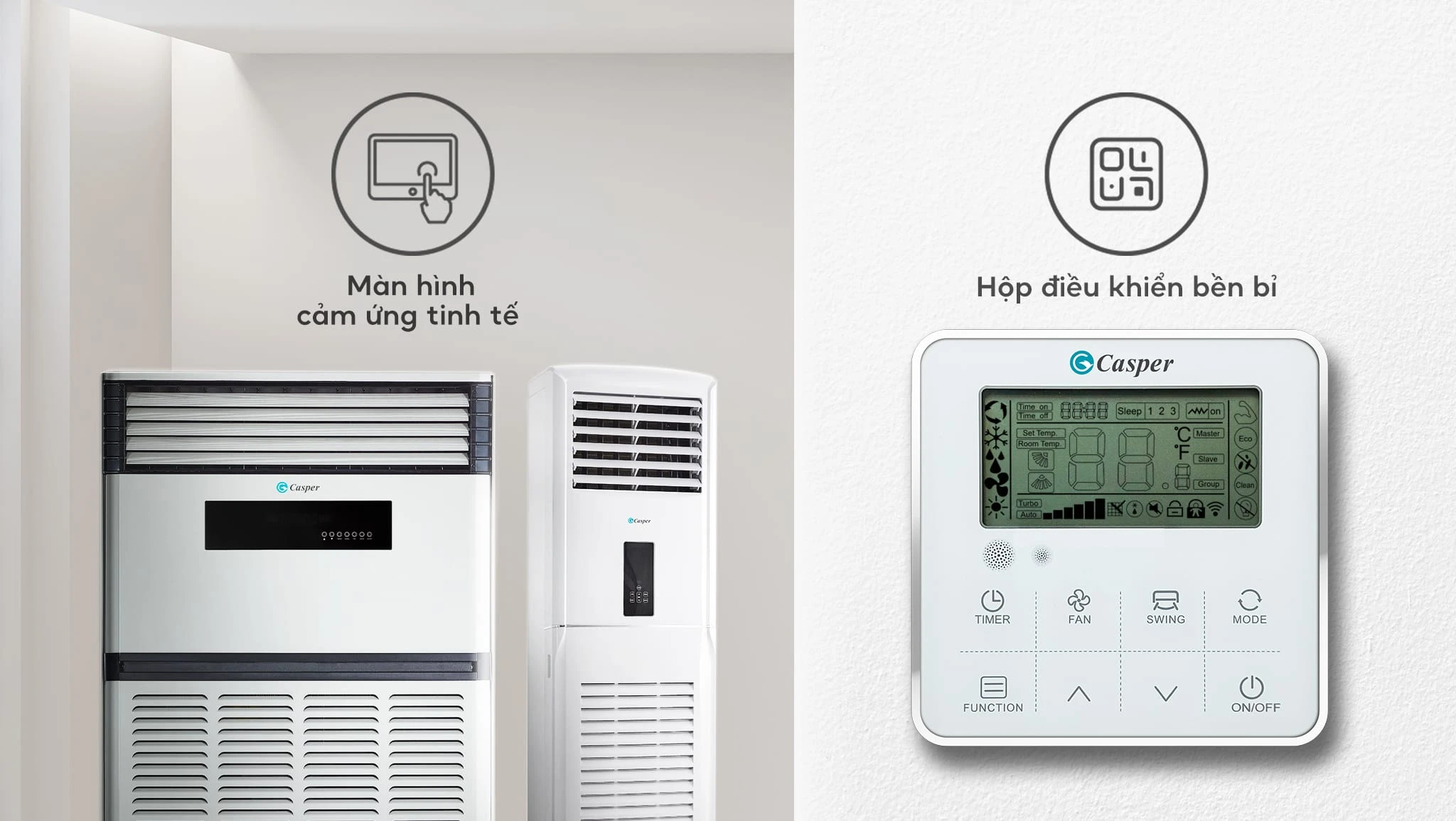 Thiết kế màn hình cảm ứng trên thân máy tinh xảo, bền bỉ hơn nút ấn thông thường, đi kèm với hộp điều khiển từ xa chất liệu mạ kẽm chống cháy nổ, bảo vệ bảng mạch