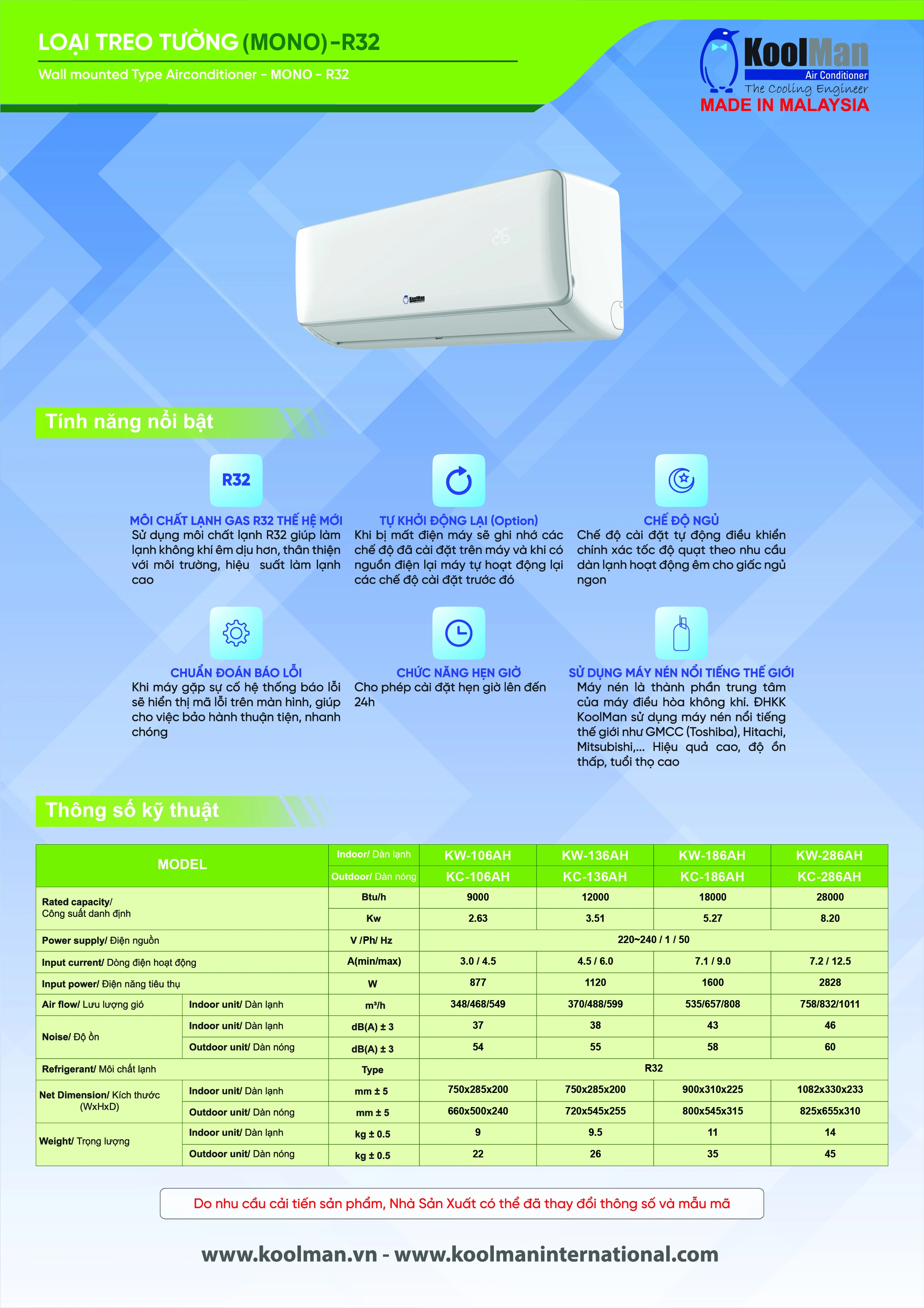 Điều hòa Koolman treo tường 18000BTU 1 chiều thường KW-186AH/KC-186AH