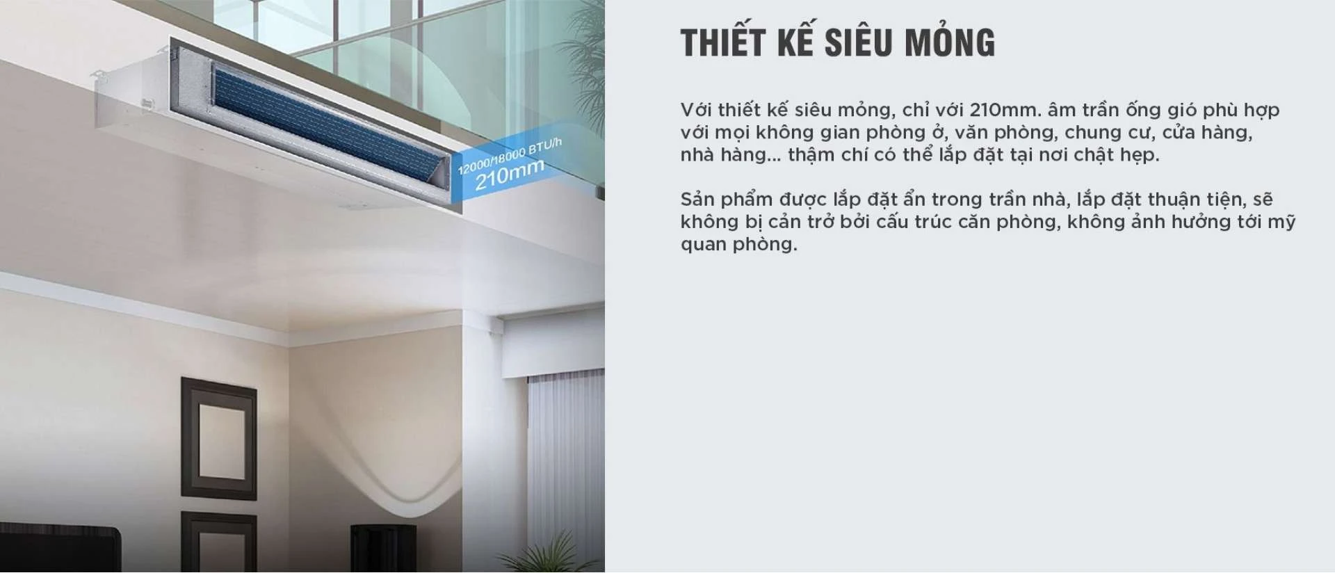 Âm trần ống gió với thiết kế siêu mỏng phù hợp với mọi không gian văn phòng, chung cư, nhà ở, nhà hàng, khách sạn… thậm chí những không gian chật hẹp, là sự lựa chọn hàng đầu cho các giải pháp không khí , thiết kế lắp đặt linh hoạt và dễ dàng bảo trì, vệ sinh.