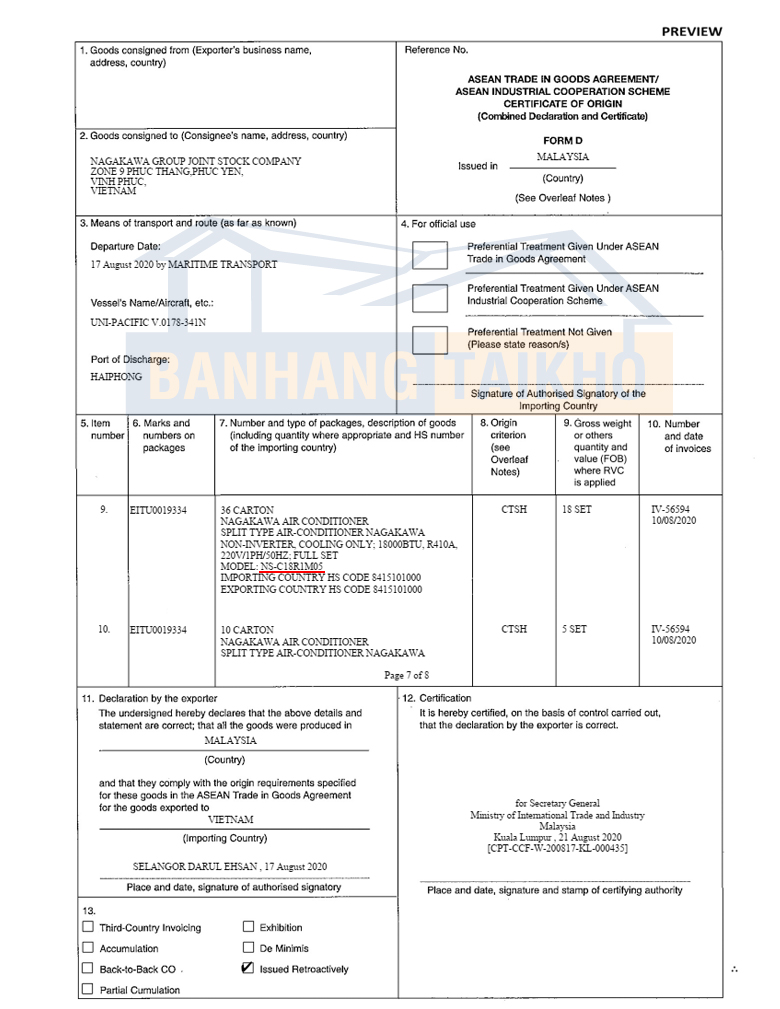 Chứng nhận CO&C/Q Điều hòa Nagakawa 18000BTU 1 chiều NS-C18R2U86
