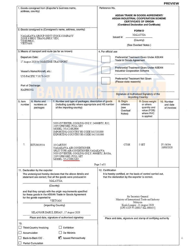 Chứng nhận CO&C/Q Điều hòa Nagakawa 9000BTU 1 chiều NS-C09R2U86