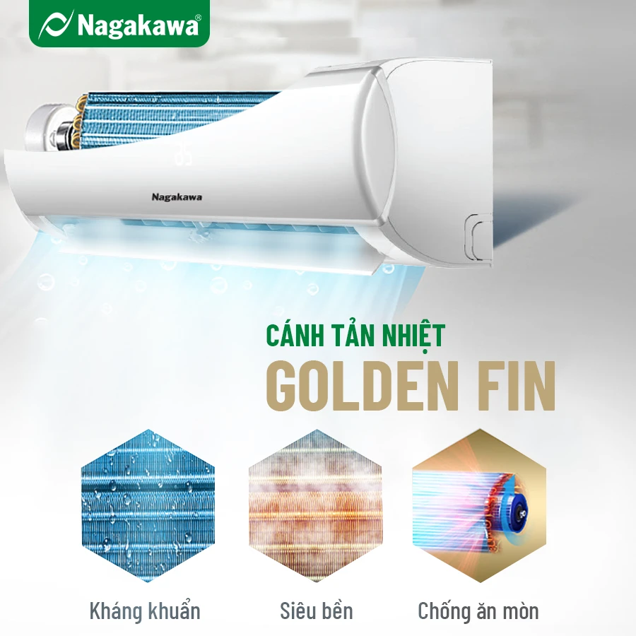 Ngoài ra, điều hòa Nagakawa NS-A24R1M05 còn trang bị dàn tản nhiệt (indoor + Outdoor) phủ lớp mạ Golden Fin kháng khuẩn, siêu bền. Nhờ lớp phủ này, điều hòa Nagakawa NS-A24R1M05 có thể chống các tác nhân ăn mòn từ môi trường khắc nghiệt vùng biển cũng góp phần nâng cao tuổi thọ cho điều hòa