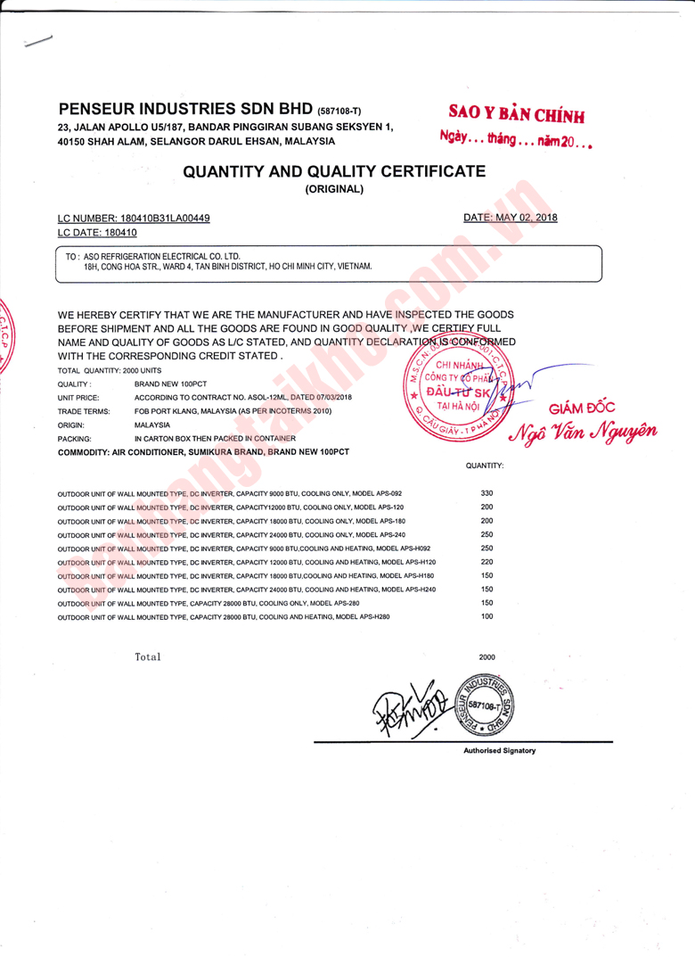 Chứng nhận CO&C/Q Điều hòa Sumikura 2 chiều 12.000BTU APS/APO-H120