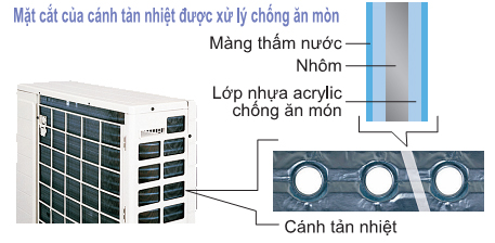 Cánh tản nhiệt của dàn nóng được xử lý đặc biệt để chống ăn mòn. Bề mặt được phủ lớp nhựa acrylic mỏng làm tăng khả năng chống lại axit và hơi muối biển rất phù hợp với điều kiện thời tiết và đặc biêt là khu vực miền trung và vùng biển.